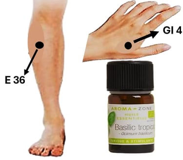 Vous pouvez travailler ces points de manière homéopathique pour cela prenez du basilic tropical en le diluant à 2%. Dans une petite bouteille vous mettez 2 gouttes d'huile de basilic et 98 gouttes d'huile végétale puis vous massez ces : doucement dans le sens des aiguilles d'une montre commencez par la main gauche et finissez par la main droite.