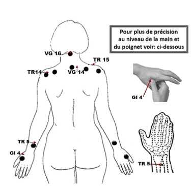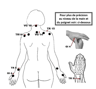 VG 16 : Juste en dessous de la bosse du crâne en haut des cervicales. VG 14 : À la base des vertèbres cervicales juste au-dessus de la bosse des vertèbres lombaires. TR 14 : Tendez le bras verticalement sur le côté vous verrez apparaître un creux à la naissance de l'épaule des 2 côtés. TR 15 : A une largeur d'une main de TR 14 en direction de VG14 des 2 cotés. Pour ces points, il faut que ça soit une autre personne qui vous pose les aimants. Pour les points extérieurs du corps : GI 4: il est facile à trouver. Mettez votre pouce sur l'intersection des 2 os qui se trouve à cet endroit. Ce point est quelquefois un peu douloureux. TR 5 : ce point se situe sur le dessus du bras à la jonction des 2 os qui se trouve avant le poignet.