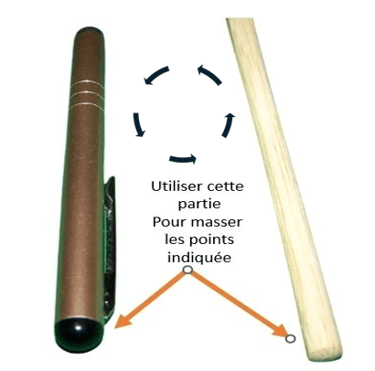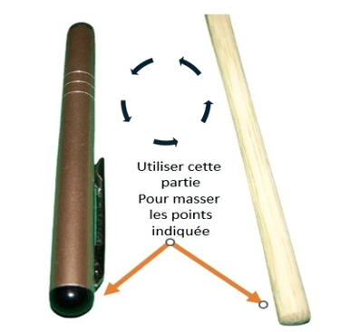 Dans ce cas, je vous conseille de demander à une personne d'utiliser les mêmes points situé dans votre dos, mais en les massant dans le sens inverse des aiguilles d'une montre, au minimum une vingtaine de secondes chaque point pour tous les points avec un doigt ou le pouce. Vous pouvez aussi utiliser un petit bâtonnet rond pour masser ces points ou le haut du stylet tactile de votre téléphone portable si celui-ci est arrondi. N'oubliez pas de masser les 2 autres points accessible, vous-même, de la même façon.